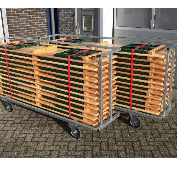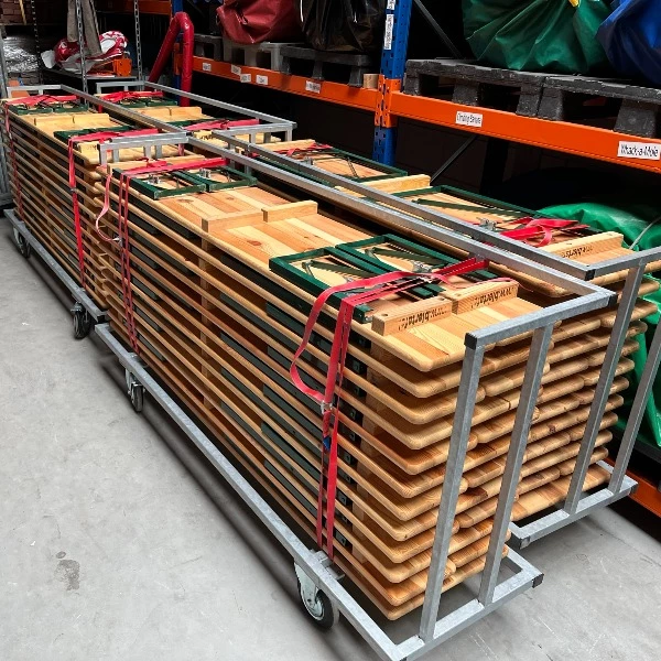 Totaal 4 sets van 6 stuks beschikbaar op 4 transportkarren (totaal 24 biertafels en 48 bierbanken op voorraad)