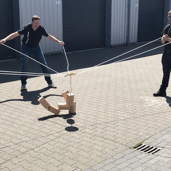 Bij dit blokken stapel spel heb je als team zelf de touwtjes in handen door de touwtjes te bewegen probeer je een toren te bouwen van de losse blokken, het team dat als eerste de hele toren kan bouwen is de winnaar, zeer zenuwslopend, spannend en leuk spel.