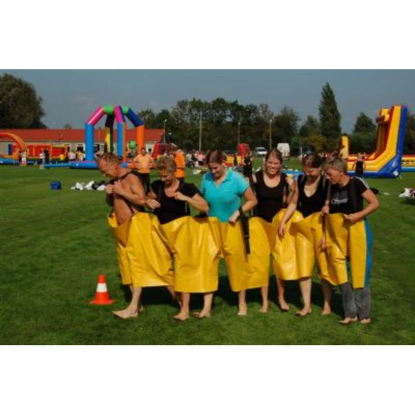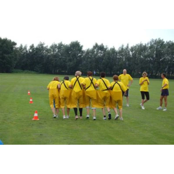 Met 6 personen tegelijkertijd in een broek een parcours afteleggen.