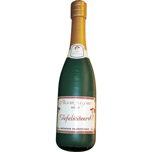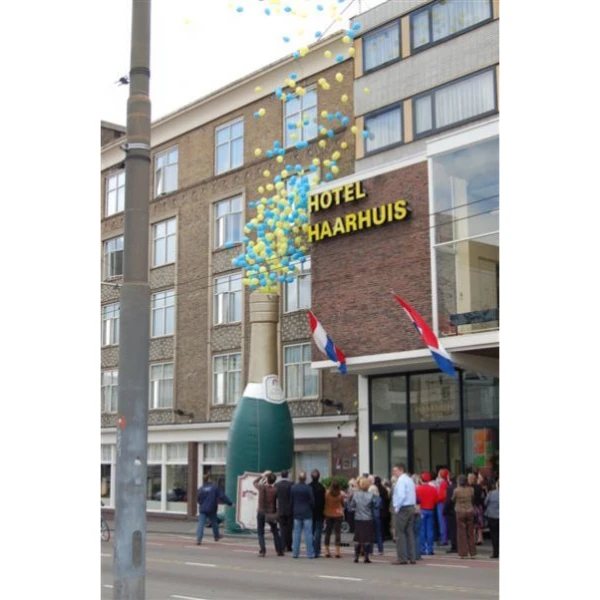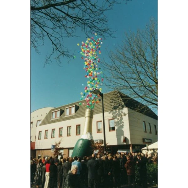 Deze 8 meter hoge champagnefles kan gevuld worden met ca. 500 helium ballonnen, na het ontkurken van een echte champagnefles zullen de ballonnen uit de opblaasbare fles ontsnappen. Zeer geschikt voor de opening van uw bedrijf, evenement of feest. Op het etiket van de fles kan welkom, gefeliciteerd of een door u te bepalen tekst staan.