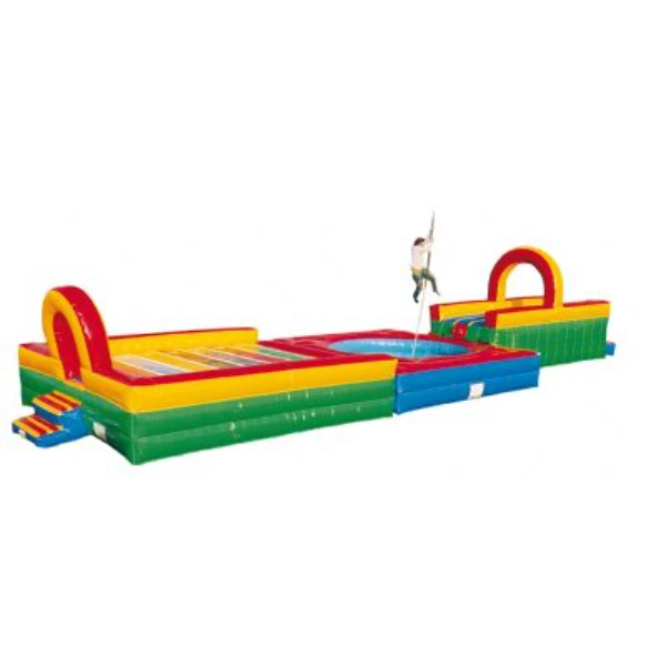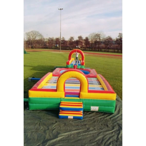 Deze spectaculaire opblaasbare Fierljepbaan is zeer geschikt voor uw zeskamp of als publiekstrekker tijdens uw evenement. De deelnemers moeten klimmend in een Fierljepboom zo ver mogelijk over de sloot heen zien te komen om zo de meeste punten bij elkaar te scoren. Als je overkant van de sloot niet haalt val je in het water en scoor je geen punten.
