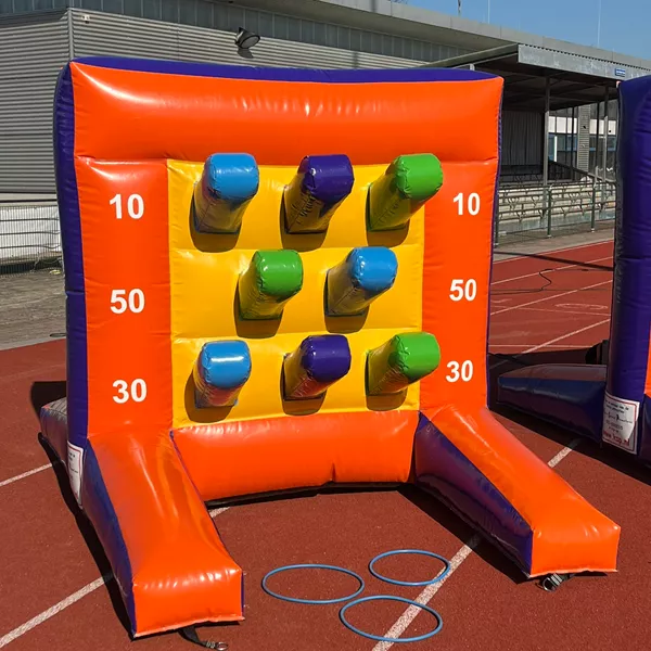 Ringwerpen party xxl spel is weer een nieuwe leuke en uitdagende opblaasbare party spel! Je kan het op veel verschillende manieren spelen, bepaal zelf de spelregels afhankelijk van het soort activiteit. Het spel is voor elke leeftijd, probeer met een ringen van een bepaalde afstand en met de juiste snelheid aan de juiste hanger te krijgen. Elke hanger heeft zijn eigen punten, hoe meer ringen je aan de hangers krijgt hoe meer punten je scoord. Scoor jij de meeste punten tijdens jullie event. Of het nu gaat om kinderfeestjes, bedrijfsuitjes, festivals, sportdagen of braderieën, deze Ringwerp muur is een hit bij jong en oud. Met variabele afstanden maken het zowel uitdagend voor volwassenen als toegankelijk voor kinderen.