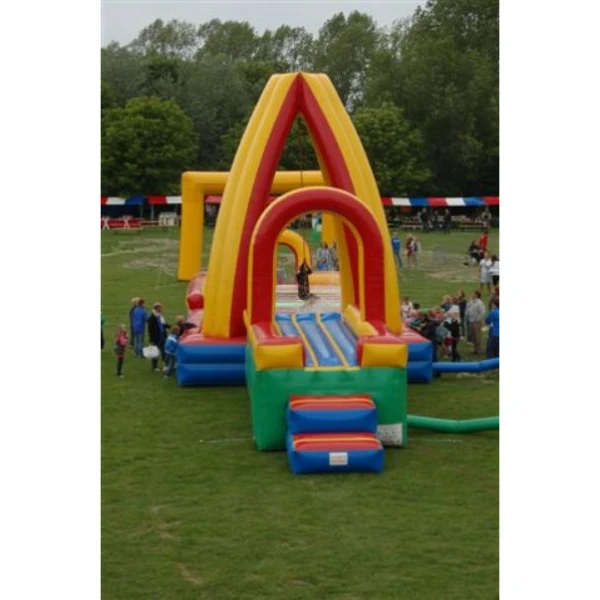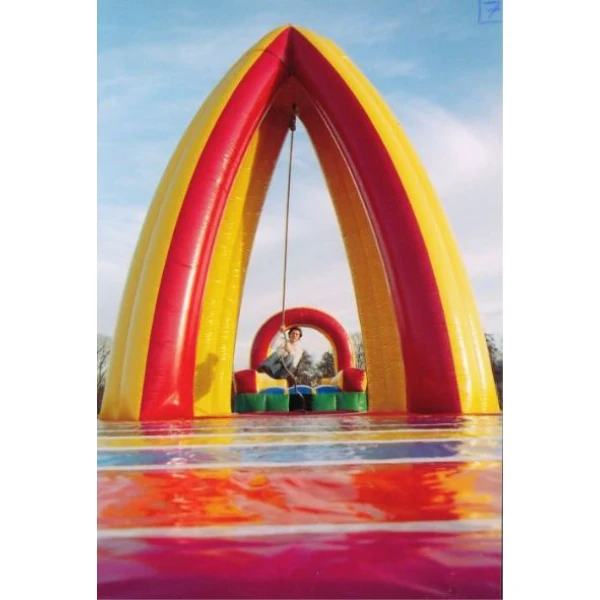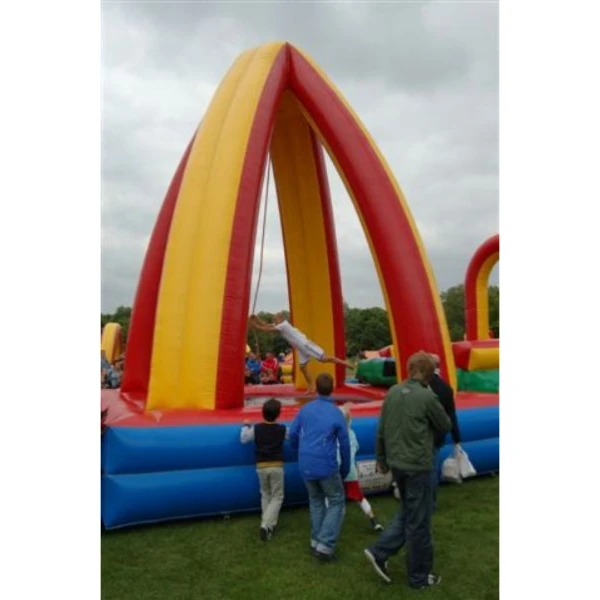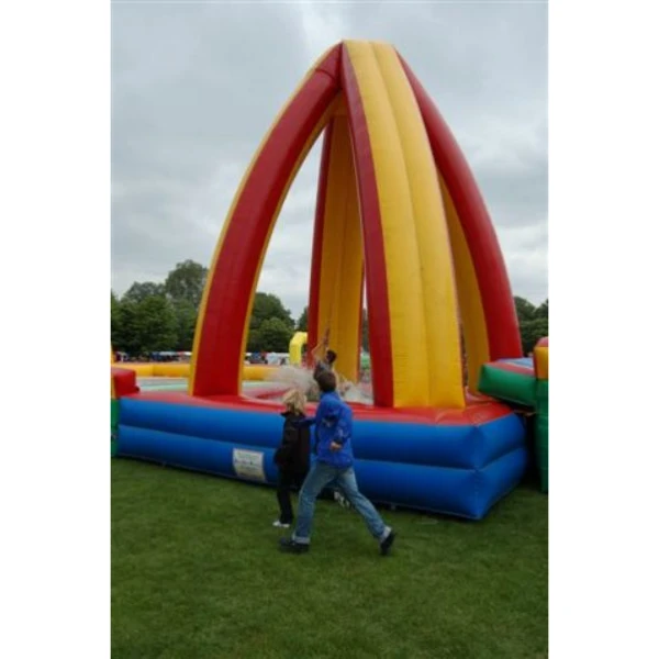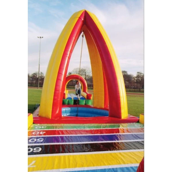 Deze prachtige en uitdagende slootjespringen baan is zeer geschikt voor uw zeskamp. De deelnemers moeten via een slingertouw zo ver mogelijk over de sloot heen zien te springen om zo voor het team de meeste punten bij elkaar te scoren. Als je overkant van de sloot niet haalt val je in het water en scoor je geen punten.